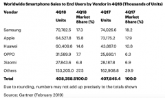 根据市场研究机构Gartner发布最新报告显示,2018年第四季度全球智能手机销量为4.084亿部,其中排名前二的仍是三星和苹果这两大智能手机领域的传统霸主。可以说,虽然国产手机品牌成长速度很快,但是短时间内依然难以撼动三星和苹果在全球智能手机市场的领先